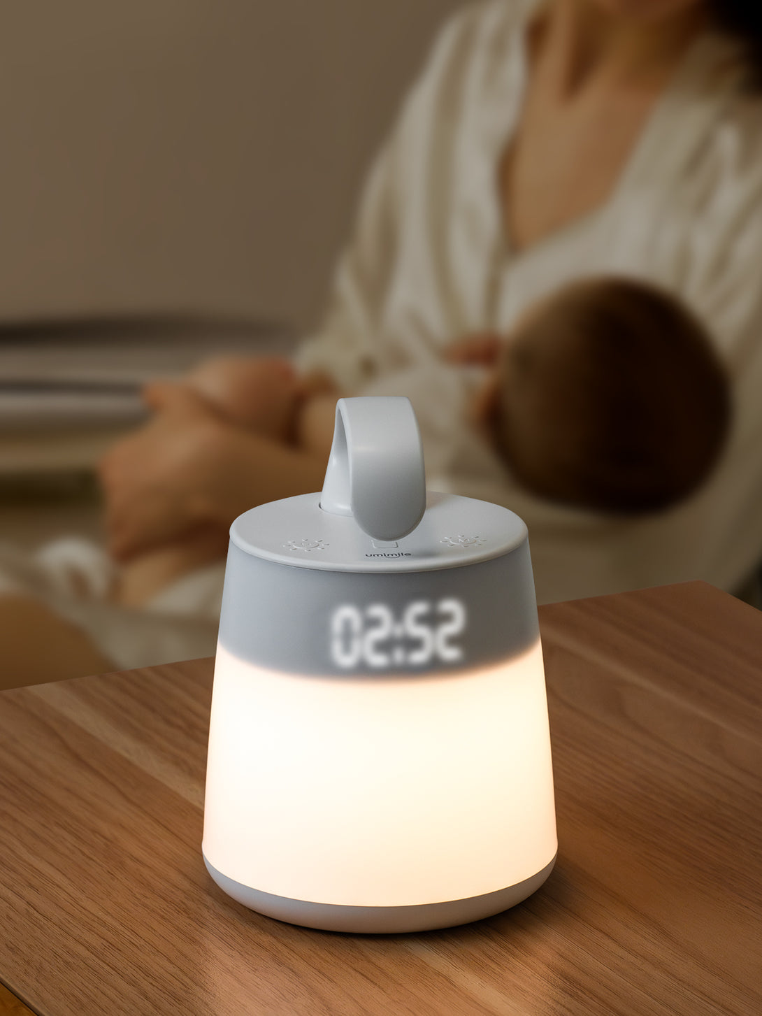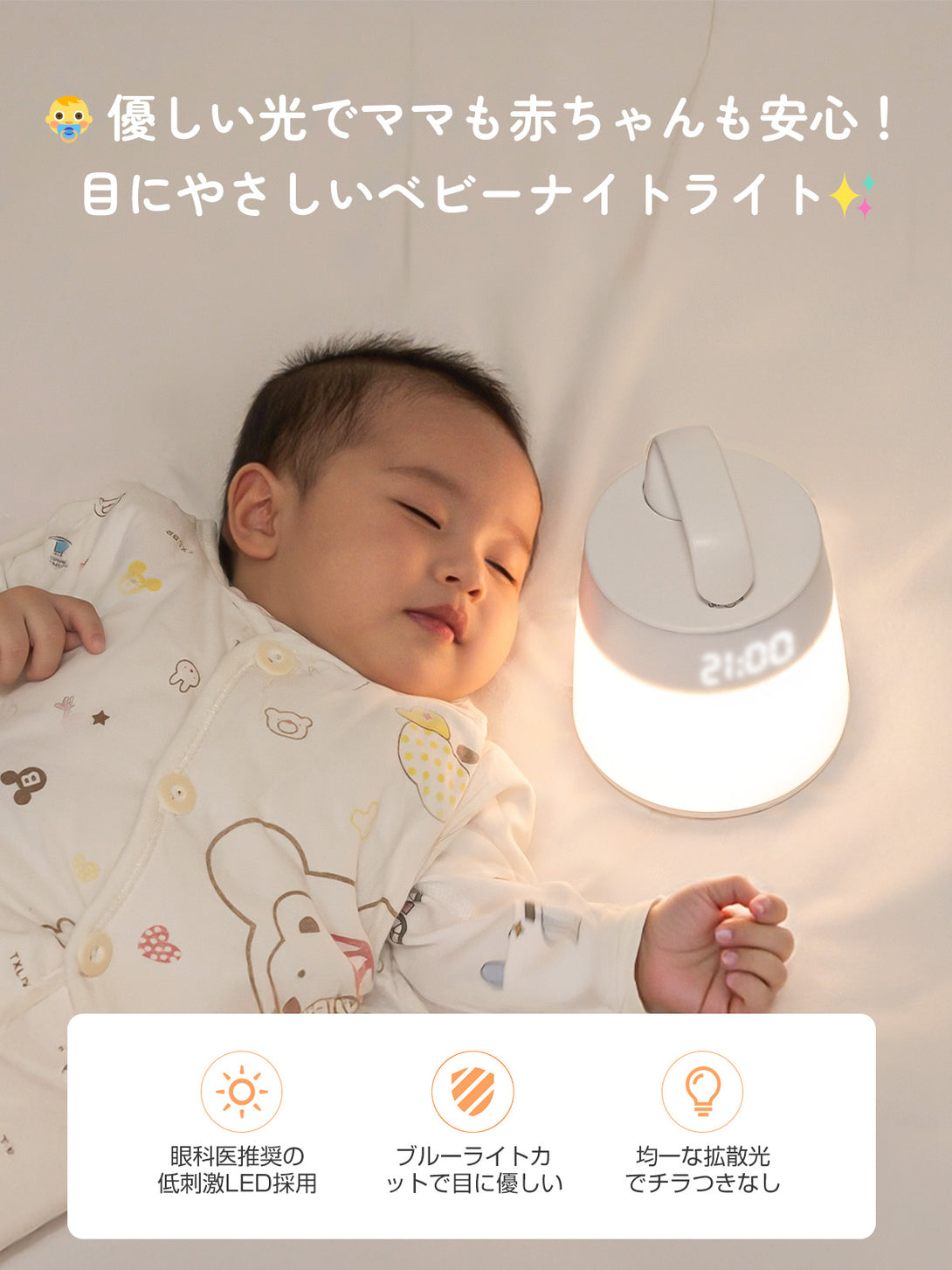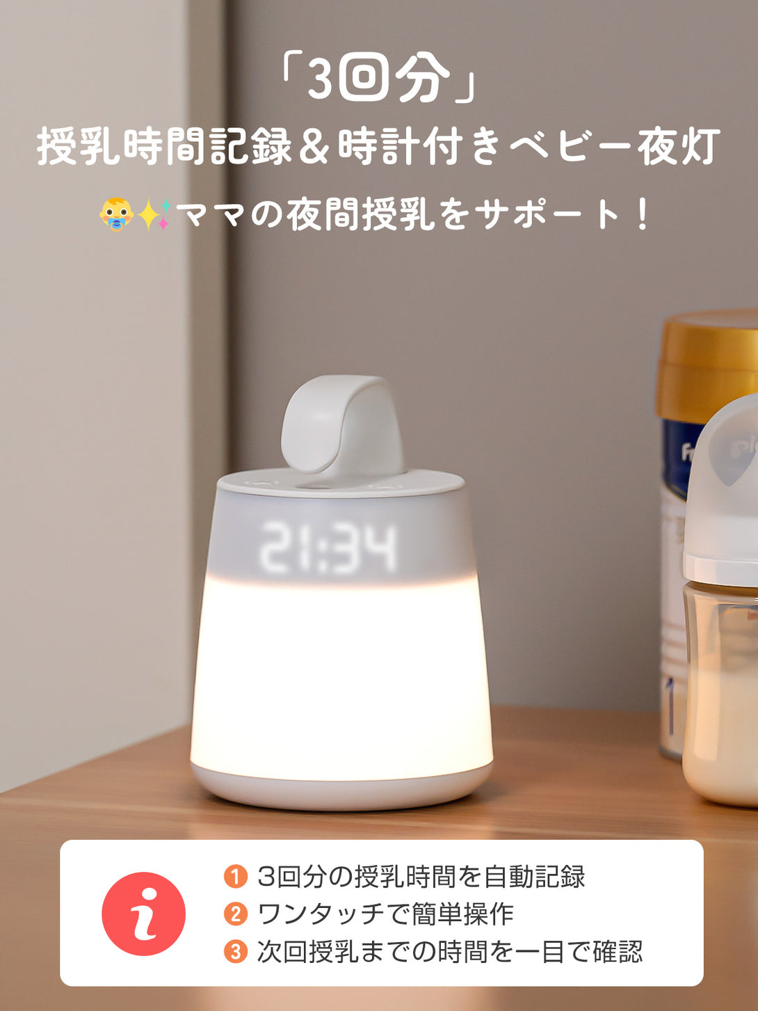 【ベッドサイドランプとしても最適】消せる時計機能で夜中もストレスフリー。デジタル時計をワンタッチでOFFに可能。就寝時は暗く、授乳時はすぐに時刻確認でき、ナイトライト機能と相性抜群です。