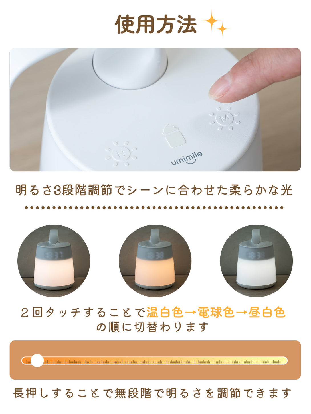 【赤ちゃんに優しい光設計】まぶしさゼロの均一照明。特殊拡散カバーで直視しても目に優しい柔らかな光。深夜の授乳中でも赤ちゃんの眠りを妨げない、プロ仕様のナイトライトです。シーンに合わせて色温度(三段階)や明るさ(無段階)を調節できます。