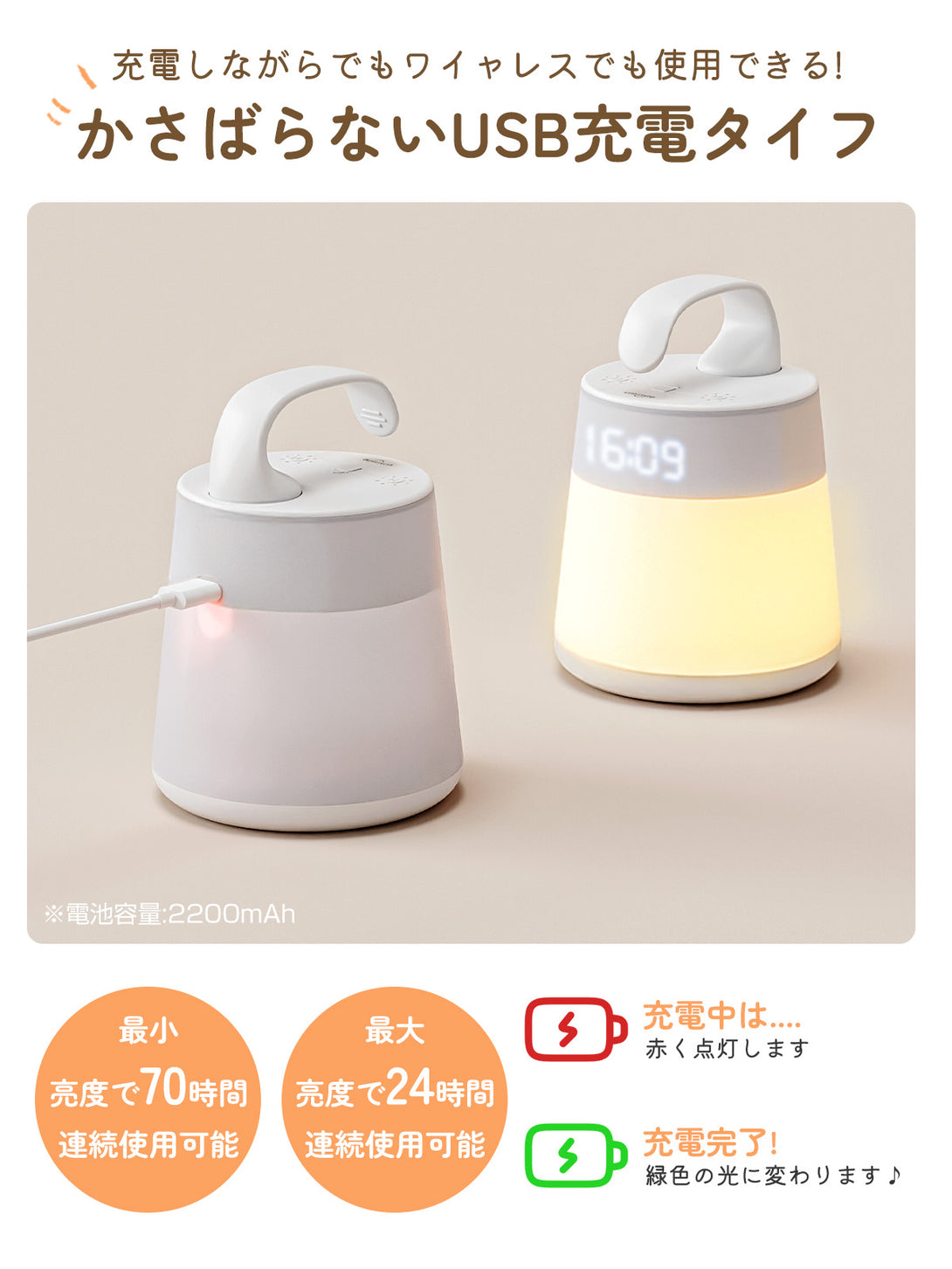 【最大70時間連続使用】充電式&手提げ付きでどこでも授乳スポットに。コードレス設計でベッド周りもすっきり。最大約3日間持続するバッテリーで、充電忘れの不安を解消します。