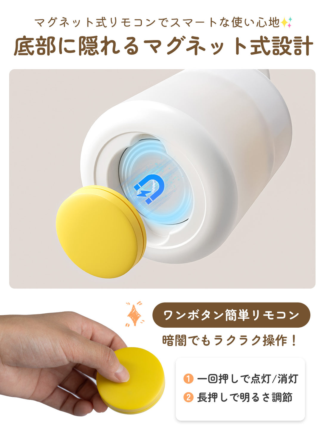 【磁着式リモコンでストレスフリー操作】「マグネット内蔵リモコン」は本体底部にパチッと吸着収納。枕元やベビーベッド柵への貼り付けも可能な超薄型設計。20m(障害物なし)の長距離操作が可能で、添い寝中でも起き上がらずに明るさ/モード切替を制御。急な夜泣き対応も慌てません。